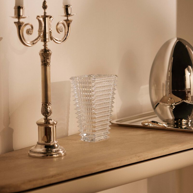 يأتي التصميم المتموج لمزهرية العين الكريستالية من تقنية استثنائية: حيث يتم الجمع بين القطع الأفقية الخارجية والقطع الرأسية الداخلية لإنتاج تأثير بصري سحري.